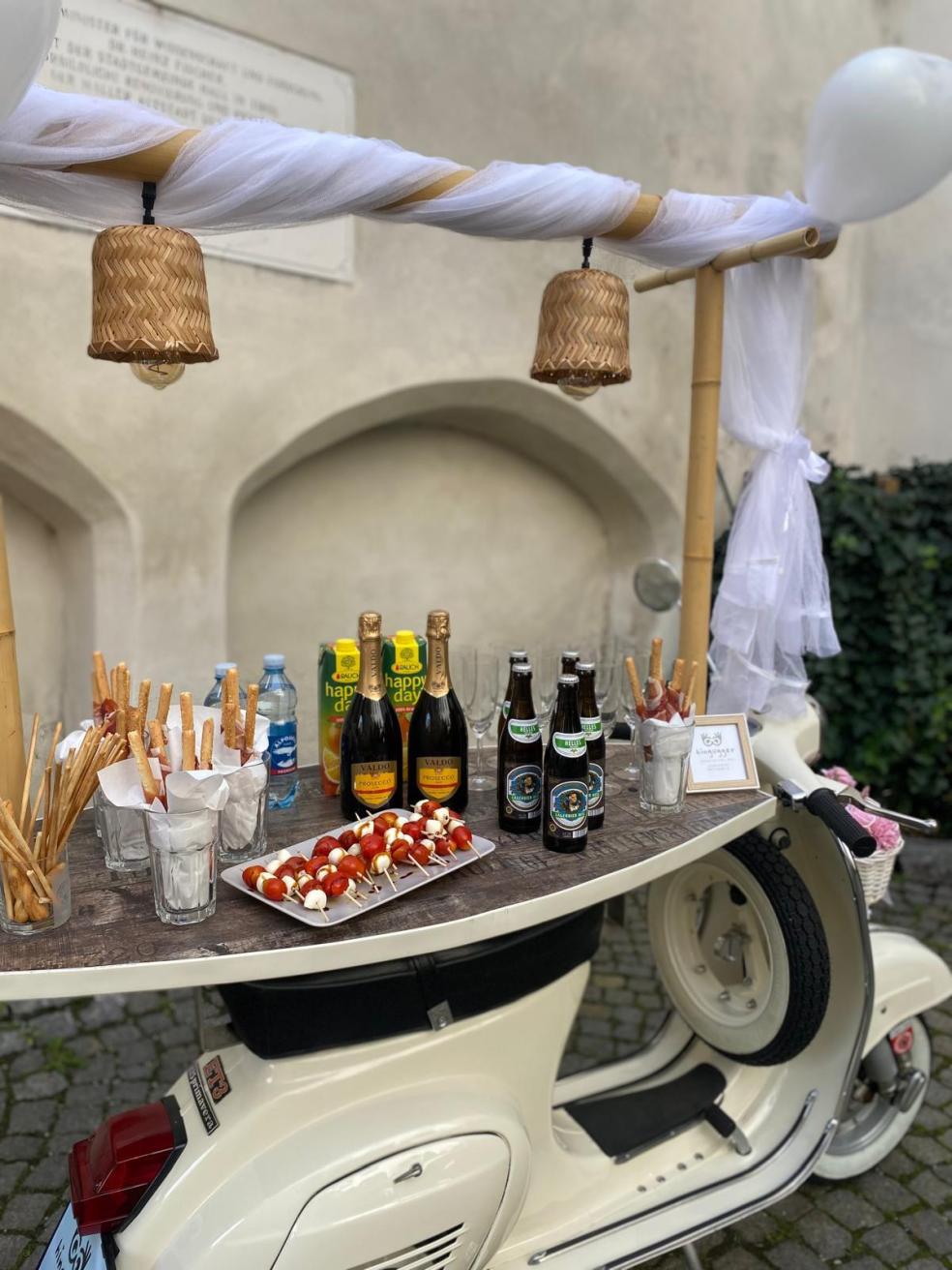 Die Vespa ist funktional und zugleich ein exklusives Dekoelement, das deinem Event das gewisse Etwas verleiht. Stell dir vor, wie deine Gäste an dieser einzigartigen Bar ihre Drinks genießen und sich von der charmanten Atmosphäre verzaubern lassen.